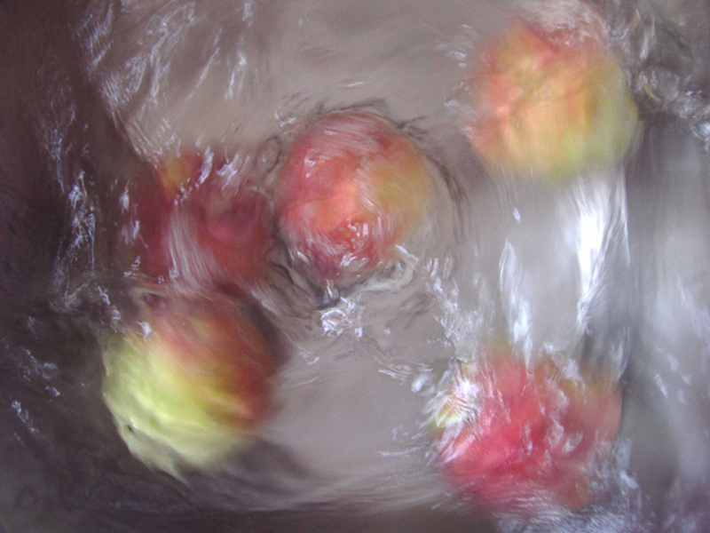 毛桃放入水槽中,漂浮在水面上,桃子上面的桃毛清洗可见